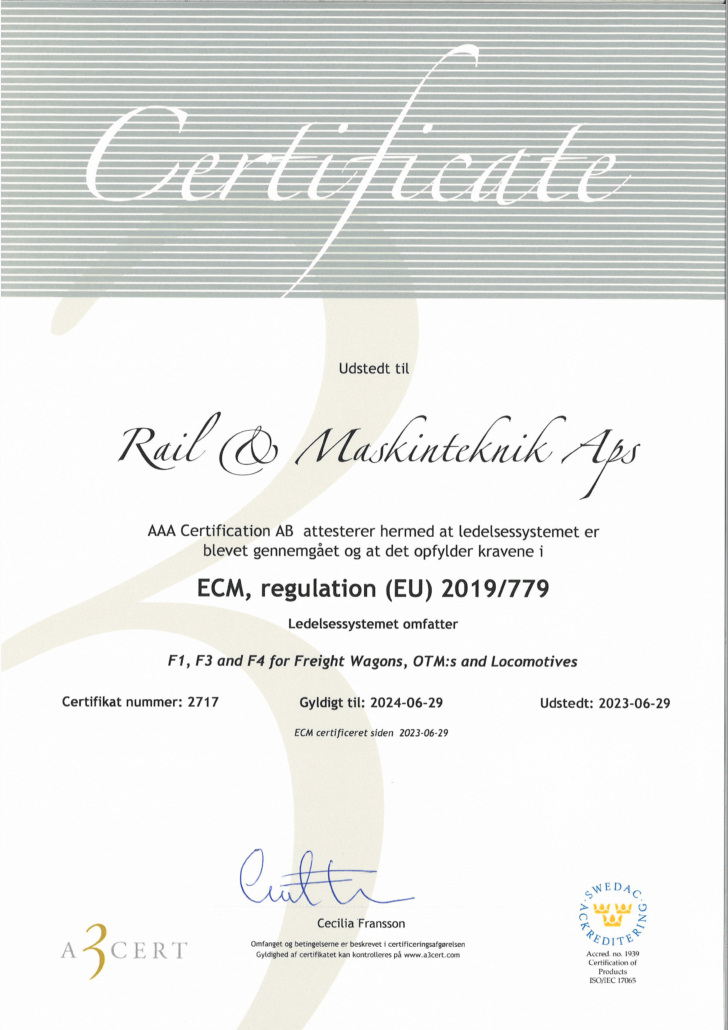Rail & Maskinteknik ApS has an ECM certificate